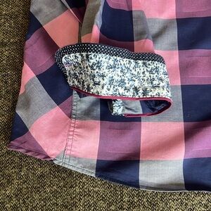 Playful colours with a navy and white floral and polka dot contrast trim on inside of cuffs and under collar.