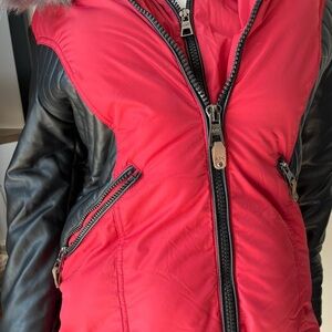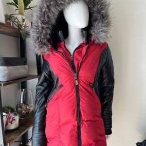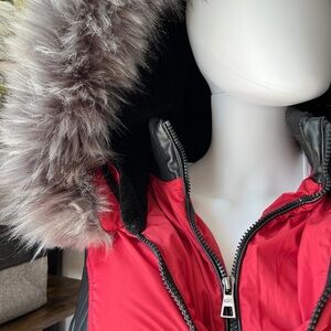 Stylish red puffer coat with a faux fur hood. Features black faux leather sleeves for a chic look. Size medium like new