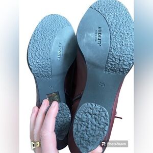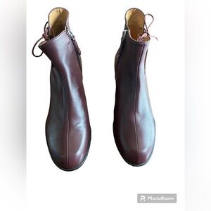 Euc Audley London burgundy ankle booties. Woman’s size 38. Very soft leather and unique heel with tie up details on the side. Only a few minor superficial scratches are noted to the boots. Could probably be buffed out. Not very noticeable when wearing. Please see close up photos.
