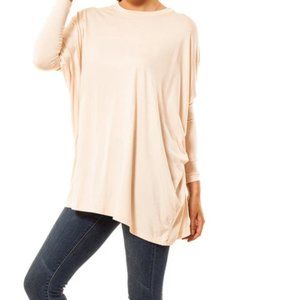 Audrey 3+1 Light Pink Dolman Long Sleeve Top. Has sleeves that are more fitted and the body is looser/flowy and depending on your size, it is long (covers butt and hips).Dolman sleeve, oversized t-shirt in a light pink, lightweight modal fabric