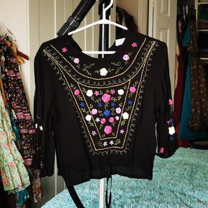 Black rayon top from Auguste the Label in Australia. Has embroidery on the front, a waist pull tie, and a button on the back at the top. Great condition, hardly worn.