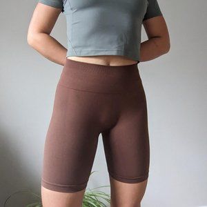 Seamless scrunch bum shorts in brown. Not squatproof but super soft and comfy for lounging