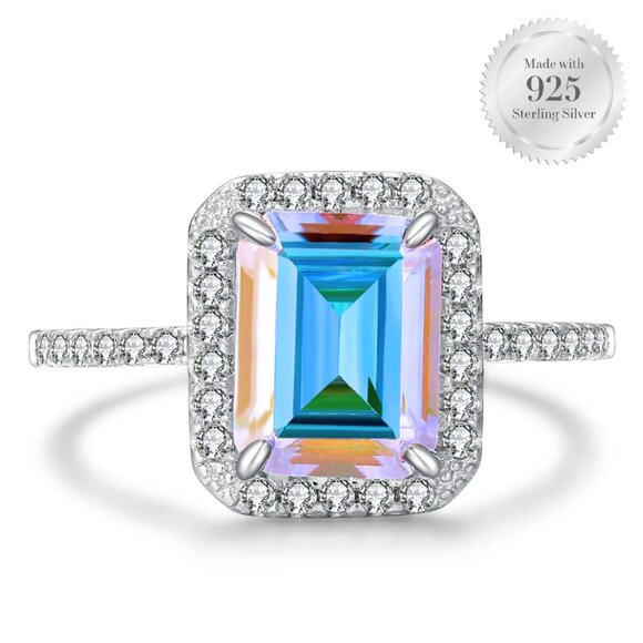 Aurora Borealis Halo Emerald-Cut Ring in Sterling Silver Charmed Aroma