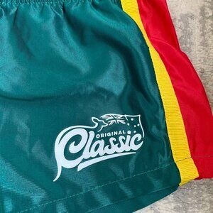 Australia rugby team shorts, size S from Rugby Australia/Aussiebum. Green with red and yellow stripe on sides, white hidden drawstring. If you really wanted to, you could make this part of a "Sexy Breakdancer" Halloween costume. Waist measures 14 inches laying flat, can easily stretch to 15.5. Inseam is 2.5 inches. Cat friendly, nonsmoking home.