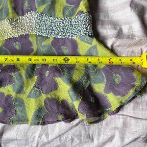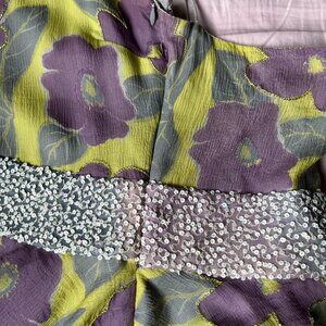 Loved Aussie designer. 100% silk including silk lining. Raised threading around flowers and sequined band across waist. Hidden side zip.