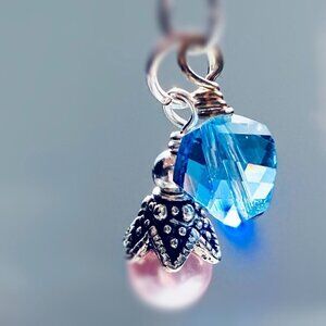 Feel Beautiful Everyday with these Austrian crystal pink pearls whose heart is a crystal covered by layers of nacre. The lovely blue is Swiss beautifully faceted glass that sparkles with every sunbeam. The colours complement this season's pastel palette wonderfully.