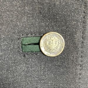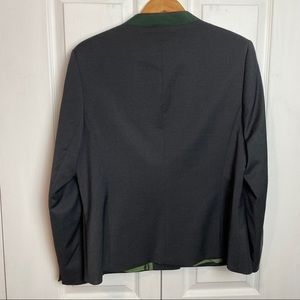 This jacket is made of super fine, slate grey wool with red & green accents. It’s fully lined (iridescent viscose/acetate blend)with welt pockets and mandarin/stand style collar. Even the pocket finishings are beautiful! Light shoulder padding, adds a nice structure to shoulder seam. Buttons are metal and top buttonhole is also welt finished. In excellent condition, with no signs of ever having been worn. Marked as size 12 US and 14 CAN. Please check measurements for desired fit.