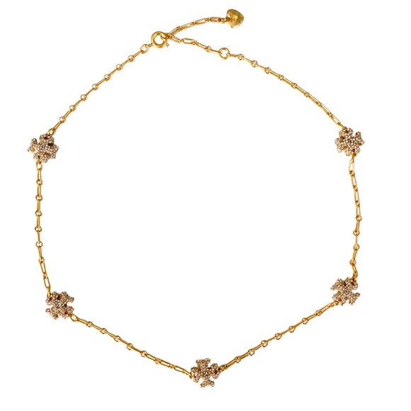 Beautiful 18k gold plated rolled brass necklace with heavily encrusted Roxanne Double T logos with sparkling crystal pavè stones.