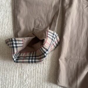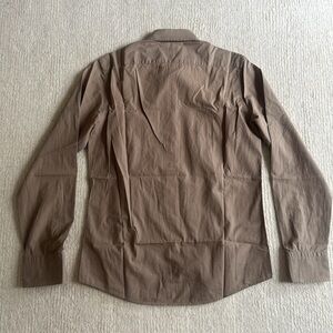 Elegant tan shirt with signature Burberry plaid inside the collar and cuffs. Ideal for versatile styling.
