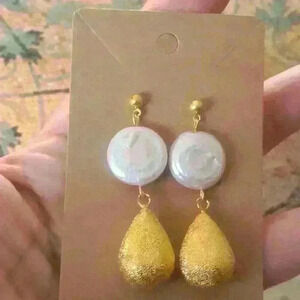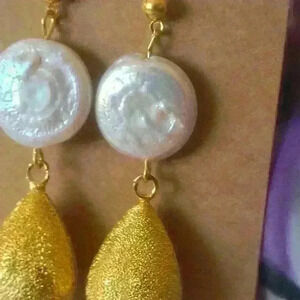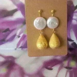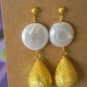 Baroque coin fresh water pear on 18k gold plated post hook and gorgeous tear drop in gold .