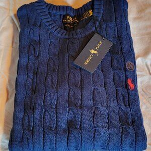 Elevate your wardrobe with this classic blue Polo Ralph Lauren cable knit sweater, with iconic red pony logo Crafted with quality materials, this 100% cotton sweater has a unisex fit, making it a great choice for both men and women. With a medium-weight feel, it's perfect for layering for comfort and style in any season. All Authentic and all Brand New with Tags & Packaging.