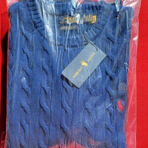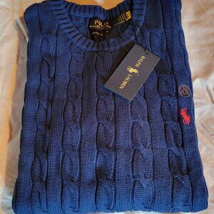 Elevate your wardrobe with this classic blue Polo Ralph Lauren cable knit sweater, with iconic red pony logo Crafted with quality materials, this 100% cotton sweater has a unisex fit, making it a great choice for both men and women. With a medium-weight feel, it's perfect for layering for comfort and style in any season. All Authentic and all Brand New with Tags & Packaging.