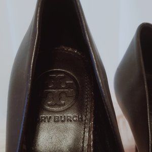 Authentic beautiful, smooth, genuine Leather Black Tory Burch heels (brand new, no box). I placed a grip/non-slip on the bottom of the shoes but it is easily removable (and leaves no adhesive, as seen in one of the pictures in this listing).