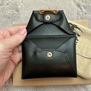 ♥ coin pouch with button closure, black leather with gold color hardware, two card slots in back