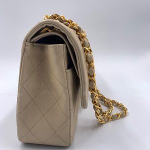 This chic classic bag is crafted of lambskin leather in beige. The shoulder bag features leather threaded polished gold chain shoulder straps and a 24k gold plated CC turn lock. The front flap opens to a leather interior with patch pockets. This is a fabulous shoulder bag, for day or evening, with the timeless style of Chanel! See photos for color under studio light and natural sunlight. This bag previously been to spa at Leather Surgeon for spa service and authentication service.