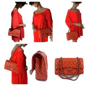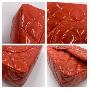 Authentic Chanel Patent classic Medium Double flap bag is crafted of patent leather in pink color. It appears more red on photo but looks more pink in person - see last photo natural light. The shoulder bag features patent leather threaded polished silver chain shoulder straps. The front flap opens to a lambskin leather interior with patch pockets. This is a fabulous shoulder bag, for day or evening, with the timeless style of Chanel! This is a beautiful bag in good condition.
