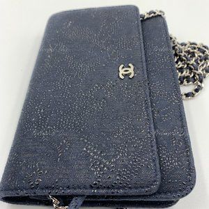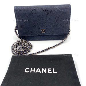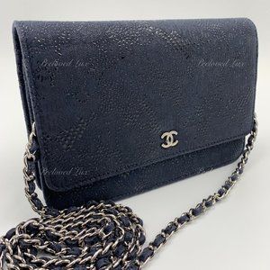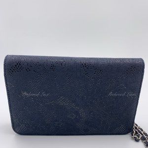 Authentic CHANEL Lace Embossed Goatskin Wallet-on-the-chain WOC Crossbody Flap Bag - Dark Navy Silver hardware