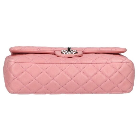 This is an authentic CHANEL Lambskin Quilted Medium Double Flap in Pink. This medium classic flap bag is beautifully crafted of luxurious soft pink lambskin leather. The bag features a silver chain-link shoulder strap threaded with pink leather, a crossover flap, and a silver Chanel CC turn-lock on the front. This handbag opens to a second flap and a matching pink leather interior with patch pockets.