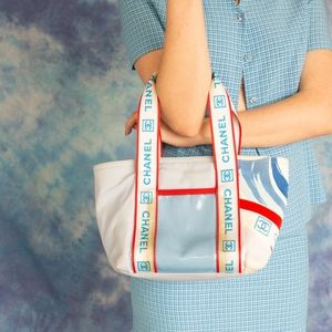 100% authentic CHANEL sport line tote, surf collection! Comes with the original surfboard keychain. In great overall condition, has staining on the backside from the aging of the glue. Otherwise in great condition. Such a unique and rare piece! Chanel monogram on the straps, blue and red print over body.