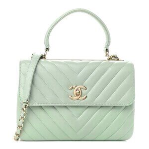 This is an authentic CHANEL Lambskin Chevron Quilted Small Trendy CC Dual Handle Flap Bag in Mint Light Green. This stylish bag is crafted of chevron-quilted lambskin leather. It features a leather top handle anchored to a Chanel logo engraved light gold bar, an optional gold chain-link leather threaded shoulder strap and a rear pocket. The flap opens with a gold CC turn-lock to a partitioned pink leather interior with zipper and patch pockets.