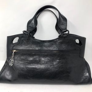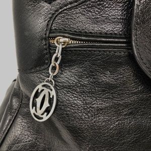 One of Cartier’s most classic and popular handbags, this Marcello de Cartier bag is beautifully crafted in the finest black leather. The exterior features open top stitched corners with perforated ‘double C’ logo on the front. The spacious interior is lined with satin textile with a cell pocket and single zippered pocket with a logo zip pull.