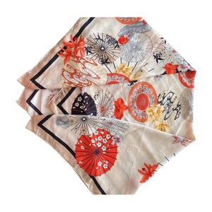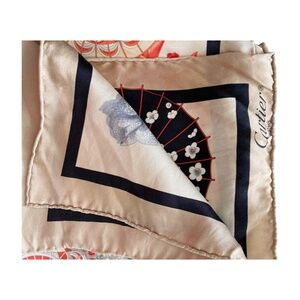 Authentic Cartier Paris silk scarf featuring an exquisite Japanese parasol and floral motif. Set against an ivory background, the design incorporates rich shades of red, orange, yellow, and black, making it a striking statement piece. Hand-rolled edges and luxurious silk fabric showcase Cartier’s timeless craftsmanship.