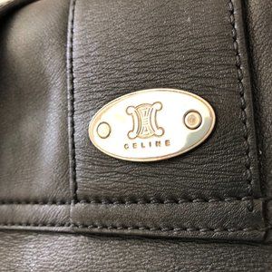 Black authentic Celine leather purse. Features a clasp at the side of the bag, long straps for easy, over the shoulder carrying, and the Celine logo throughout the bag.