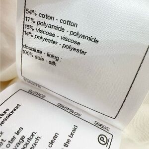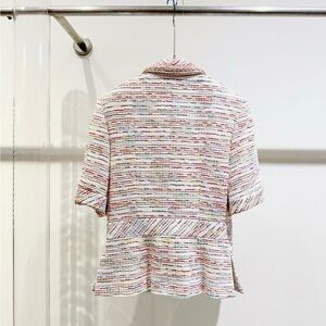 Chanel tweed blazer with short sleeves. Features a blend of white and pink hues. Classic notched collar and front pockets.