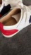 Stylish men's Christian Louboutin sneakers featuring a sleek white, navy blue and red design.