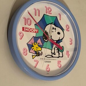 Authentic Citizen Japan Snoopy wall clock, 1980s works perfect! Retro peanuts comics cute battery operated clocks with peanut comic strip illustrated drawing book character showing Woodstock and snoopy the beagle dog puppy by Charles m Schulz. copyright 1965, 1958 United feature syndicate. Retro vintage Japanese clocks, timekeepers, wall clocks hang on wall hanging clocks with back hanger hole, uses one battery, adjustable ticking hands. Bought new in Hong Kong Asia in the 1980s or early 1990s 90s, authentic citizen Asian watches watch brand, like new perfect condition tells time accurately quartz motion time keeping hours and seconds. Pastel colours baby sky blue with pink, white, black yellow blue turquoise green colors. Cartoon comic strip characters yellow bird dog w umbrellas. great for kids child bedrooms offices funky kawaii decoration. Quartz clocks use an electronic oscillator regulated by a quartz crystal to keep time, making them very accurate. Includes melamine case with acrylic crystal/face cover. Round shape circle Measures 9.75" diameter × 1.5" deep. Used 1 AA battery