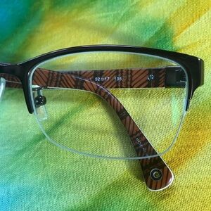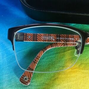 Coach eyeglasses HC 5038 Montana 9076 satin brown. These sophisticated eyeglasses featuring a sleek semi-rimless frame are in very good preloved condition. Hardly worn! The lenses that are presently in them can be changed to fit your prescription. Case included. Small holes on bottom ends of arms to attach a cord or chain. These frames sell for $250 to $300. By purchasing these glasses you will only have to pay to change prescription and will save on the cost of frames. A savings of hundreds!