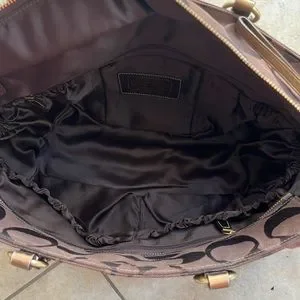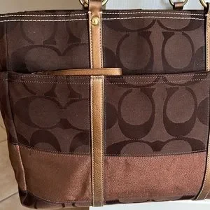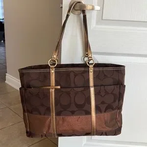Brown and Gold. Lots of inside pockets with large outside zip pocket. Can be your everyday purse also a work, travel or baby bag
