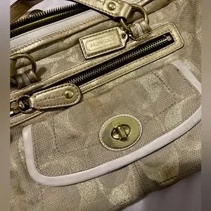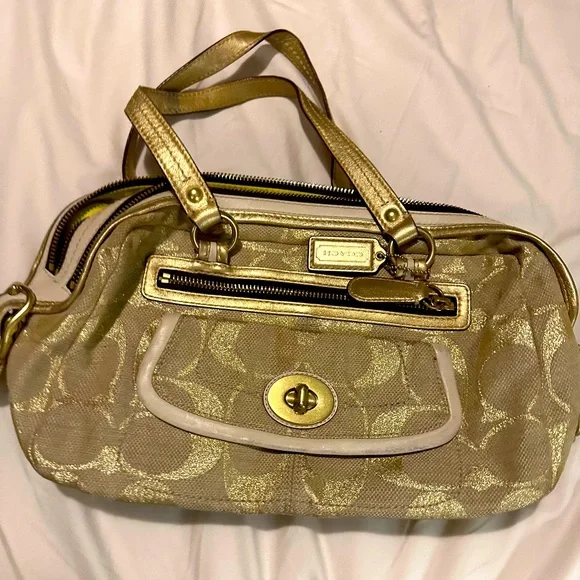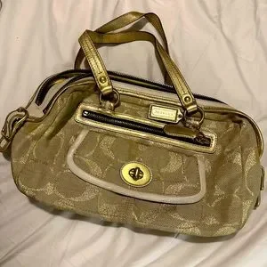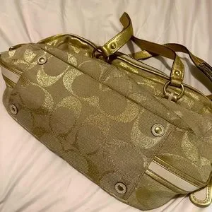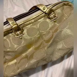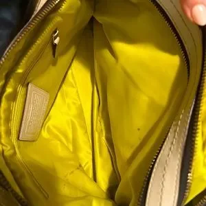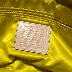 Beautiful gold canvas with classic coach print all over the bag. Inside is neon yellow!