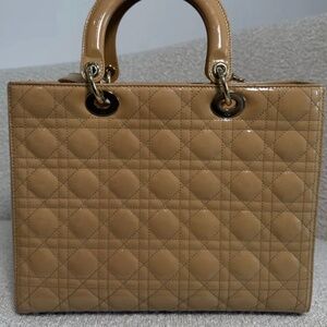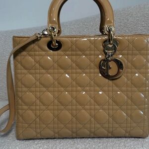Authentic Dior Large Lady Dior Bag Beige Patent Gold HDW