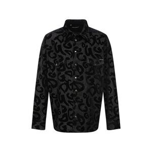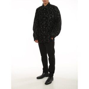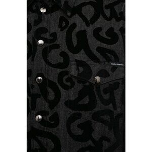 This is an authentic Dolce & Gabbana Denim Dress Shirt Jacket in Denim Black / Grey. Long Sleeve, button down. Graphic design. Size 44. Hanger included.