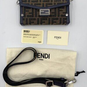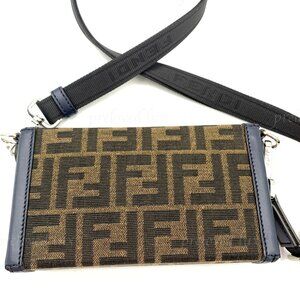 This beautiful mini soft trunk bag is crafted of Fendi signature FF Zucca coated canvas in tobacco brown with dark navy blue leather trim. The bag features an adjustable leather shoulder strap and silver hardware, which can fit a cell phone. Can be use as a phone pouch.
