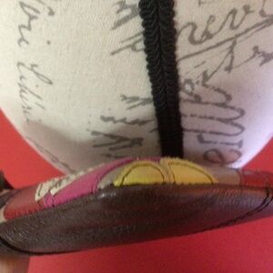 Eye catching Fossil 100% leather wristlet wallet with pretty flower accents in bold red, yellow, green, are punctuated with pewter tone metal diamond-shaped studs. This is the perfect accessory to use as a wallet or on its own as a wristlet clutch purse to hold you small everyday essentials, money, cards, keys, lip gloss, even your phone.
