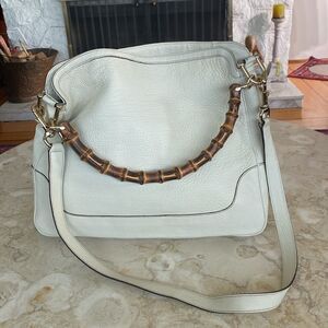 This extra large sized bag, is made of gorgeous ivory tone buttery soft leather. Combining recognizable elements of the House, this gorgeous and timeless shoulder bag is defined by its bamboo handle, which is in mint condition, and crafted from top quality Italian leather, the bag is further accentuated by a detachable leather shoulder strap.