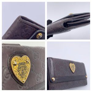 Preowned Authentic Gucci GG Dark Brown Long Wallet. 7.5"X3.75". No box&No dust bag. Outside: Hardware is gold color however some area is turning silverish color. Hardware with scratches. Overall the exterior with rubs/scratches/stains/darkening/uneven color on leather from previous used. Corners with rubs on canvas and leather. One side of the fold with rub damage. Inside: darkening/stains/rubs/scratches inside. Inside lining with some scratches/rubs. No odor. NO OFFER