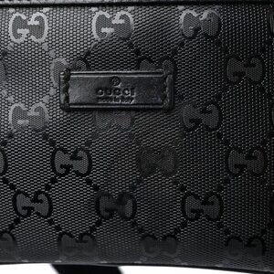 This is an authentic GUCCI Imprime Monogram Belt Bag in Black. This chic belt bag is finely crafted of black Gucci GG monogram embossed coated canvas. The bag features an adjustable canvas belt strap and silver hardware. The top opens to a black fabric interior with a zipper pocket.