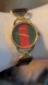 Stylish Gucci watch featuring a gold frame. Green face with bold red stripe. Iconic design.