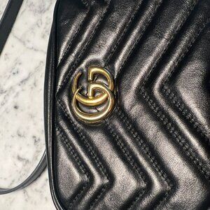 Authentic black matelassé leather Gucci Marmont Small Shoulder Bag for sale, in very good shape and clean! 9"x 5" x 3", hardware has minimal wear, matelassé leather in great shape and inside like-new.