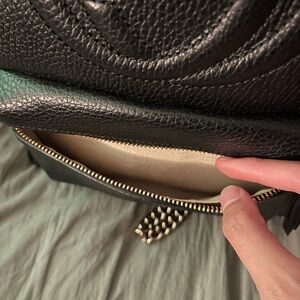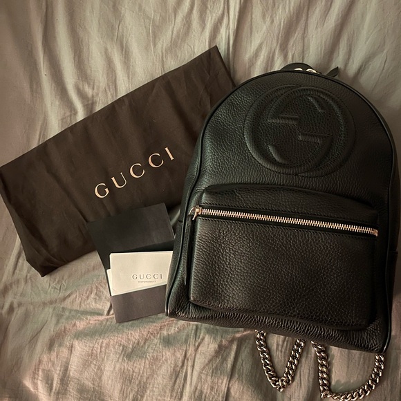 Authentic Gucci Soho Backpack, has lovely soft pebbled leather and a silver almost gunmetal chain strap. This bag has been well loved but i’m really trying to downsize my closet at the moment for spring! and am letting her go. She does have a small stain on the inside at the bottom of the bag but nothing major, This bag has been stuffed when being stored to keep its shape. Comes with the original dust bag and paper work that came with it when the bag was purchased. 🙂