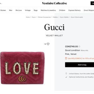 This elegant card case is crafted in pink velvet. This wallet features an antique gold-tone GG interlock logo and the word "LOVE" embroidered in beads on the front. The flap opens to a matching pink leather interior with card slots, a zippered compartment and a note compartment.
