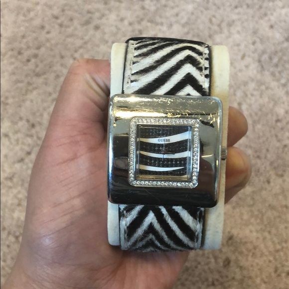 Authentic Guess watch in zebra print with silver hardware. Adjustable strap in perfect condition with a few scratches on the face of the watch. Mirrored face design. Comes without box because I had it stored in a watch box. Taken very good care of!