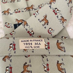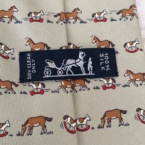 In excellent preowned condition beautiful authentic Hermes 100% silk tie. In an elegant soft green tone this luxury tie features an equestrian motif with horses and rocking horses. A classic yet fun piece.