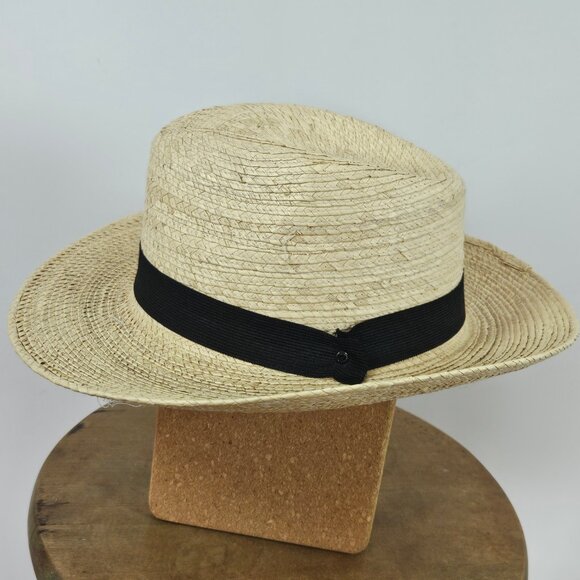 Authentic, handmade Panama-style straw hat. Black ribbon detail around crown.