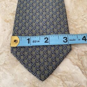 In excellent preowned condition authentic Heemes 100% silk tie featuring an all-over blue and gray chain pattern on a green base.