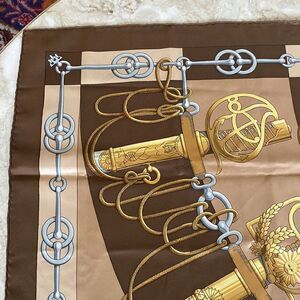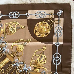 In excellent preowned condition gorgeous authentic Hermès Cliquetis 100% silk scarf. Large 90cm square size it boasts an elegant and luxurious colour palette with rich browns, tans and gold tones. All hand rolled edges. No tag.