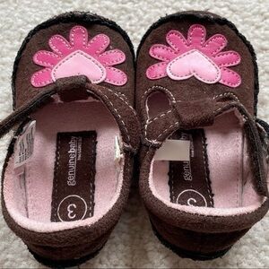 Genuine baby by O’shKosh baby girl shoes in size 3 brown with pink heart, in excellent condition. Has anti -slip rubber in the shape of flowers but these shoes are soft soles with ankle strap. Synthetic materials, man made, pink stitching around shoes.